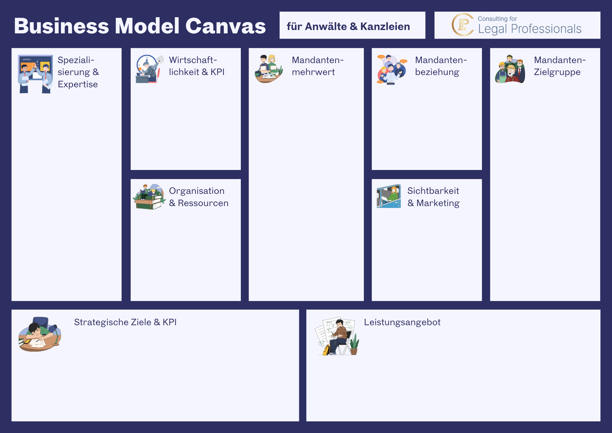 Das Business Model Canvas für Kanzleien ist speziell von CLP als auf Juristen spezialisierte Unternehmensberatung entwickelt worden: Es ist ein strategisches Analysemodell, das die wichtigsten 9 Elemente einer Anwaltskanzlei übersichtlich darstellt. Es hilft Kanzleieigentümern, Zielgruppen, Mandantenmehrwert, Leistungen, Ressourcen, Einnahmen und strategische Kennzahlen systematisch zu analysieren und integriert berufsrechtliche Anforderungen und Beschränkungen.