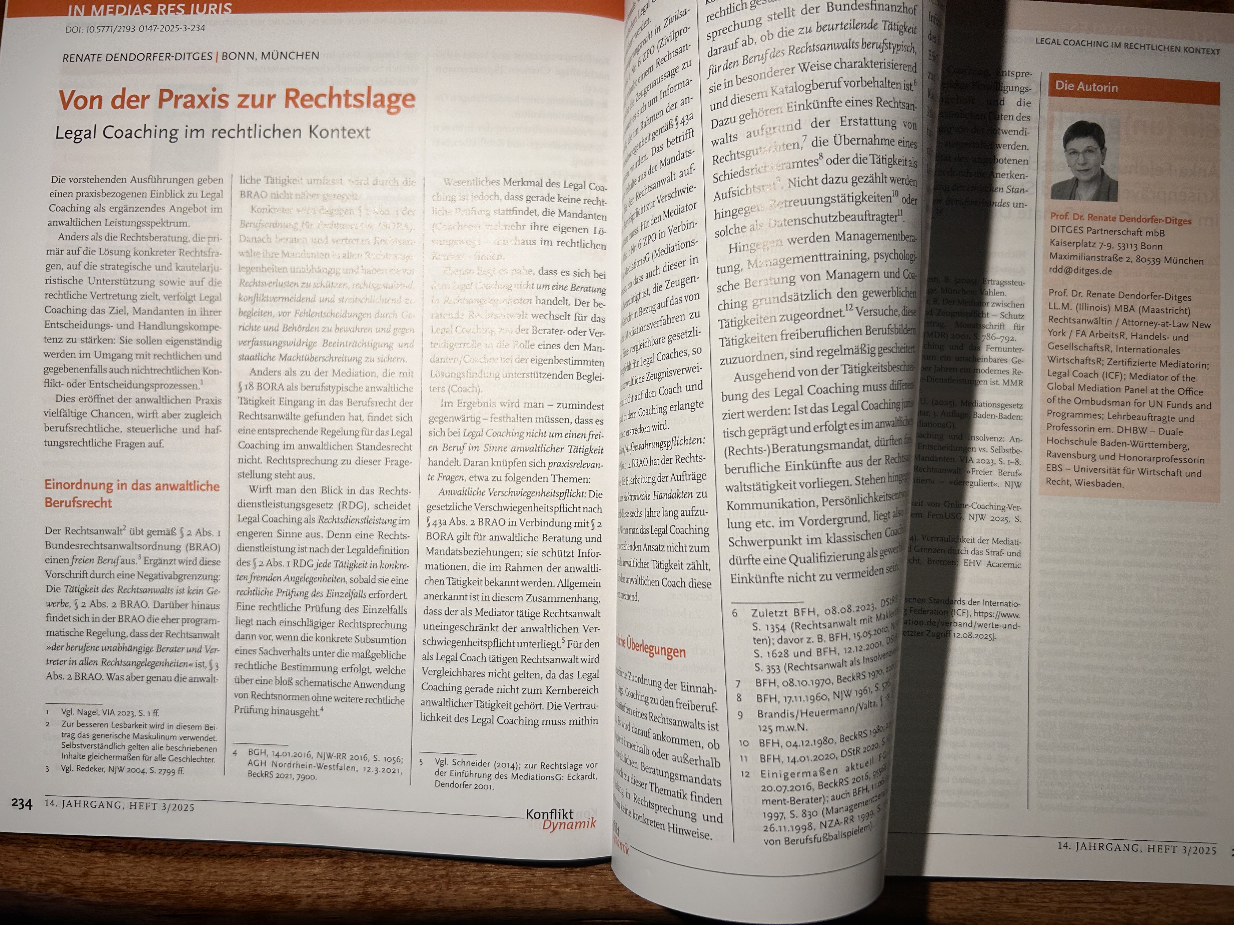 Im juristischen Fachmagazin für Mediatoren KONFLIKTDYNAMIK stellt Prof. Dr. Renate Dendorfer-Ditges in der aktuellen Ausgabe 03/2025 die kompexen Themenfelder bei der praktischen Anwendung von Legal Coaching im juristischen Beratungsmandat zusammen.