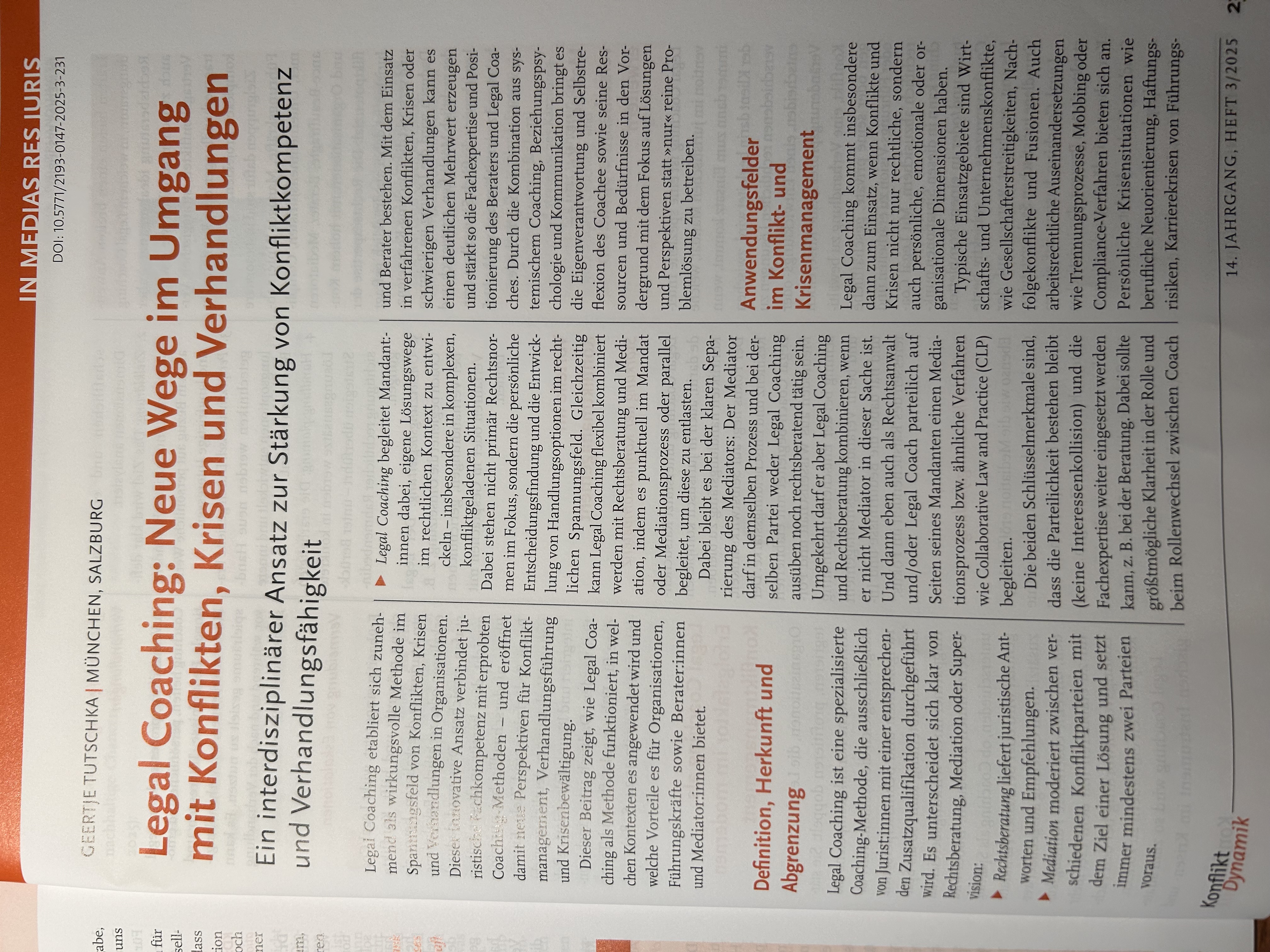 Dr. Geertje Tutschka stellt in der aktuellen Ausgabe 03/2025 Definition, Historie, Anwendungsfelder und Methodik des LEGAL COACHING insbesondere im juristischen Beratungsmandat vor. Dabei kann sie auf einen reichen Erfarhungsschatz aus über 10 Jahren Erfahrung in der Ausübung und Lehre der Methode zurückgreifen. Sie ist vom ionternationaeln Berufsverband für Coaches (ICF) mit über 2.500 Coachingstunden als "Master Certified Coach" zertifziert.